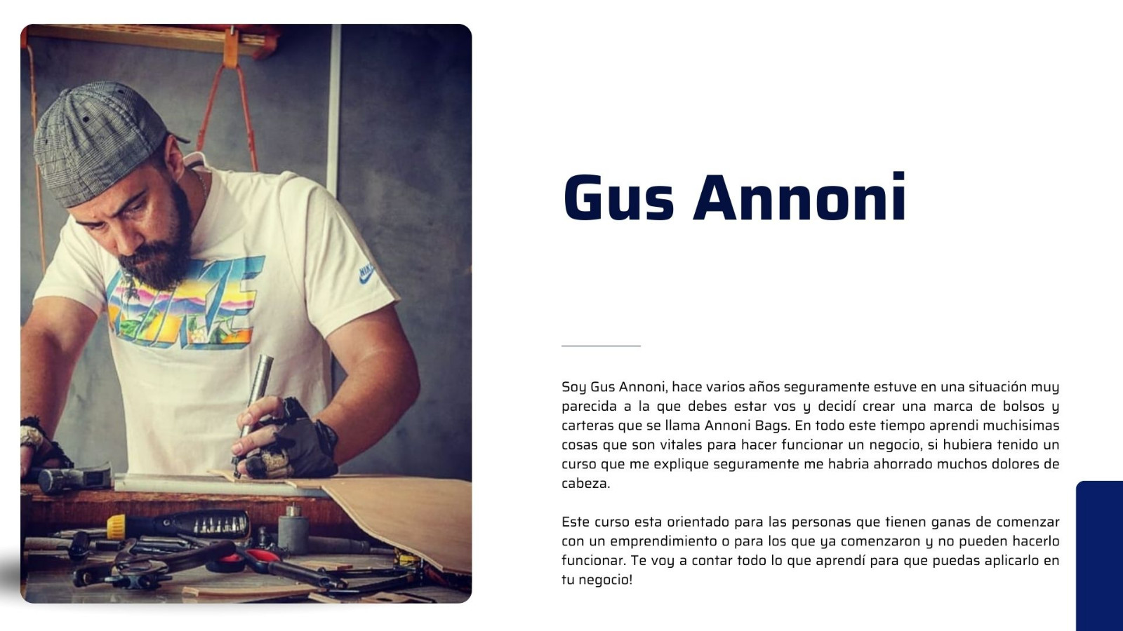 Hola! Soy Gus Annoni, me recibí de abogado a los 24 años, y a los 30 cuando me quedé sin trabajo, en ese momento decidí cambiar radicalmente el rumbo de mi vida. Cree una marca de bolsos y carteras que lleva mi nombre y hace muchos años se convirtió en una de mis fuentes principales de ingresos. Te voy a ayudar a que hagas lo mismo que yo con Annoni Bags!